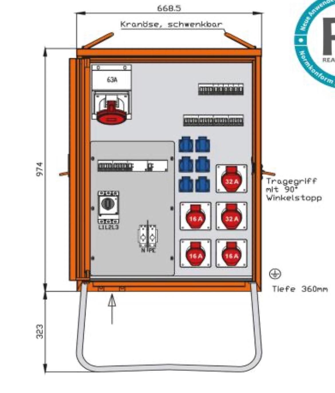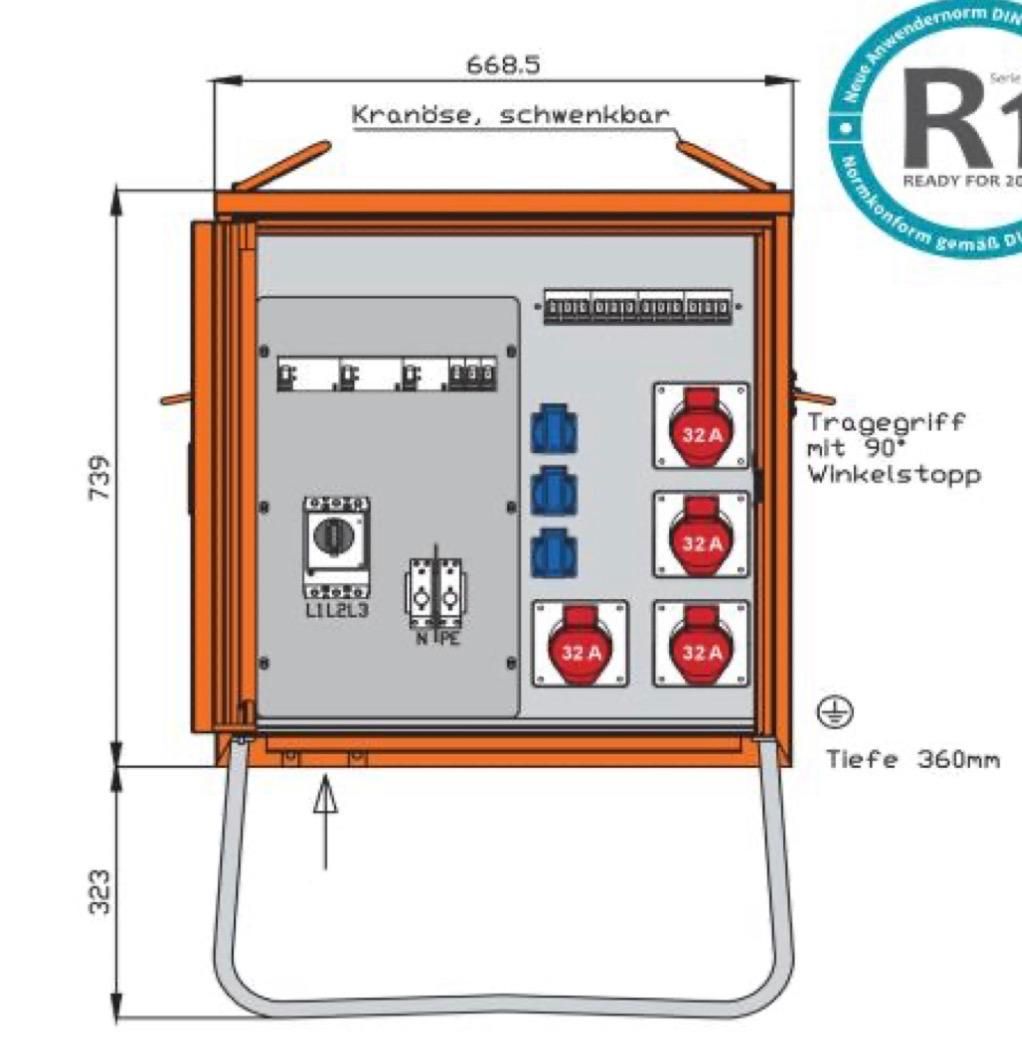 - Vier CEE-32A-Abgänge und drei Schuko-Steckdosen für flexible Nutzung
